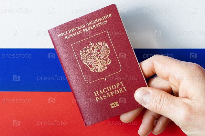 Рука мужчины держит международный паспорт РФ на фоне национального флага