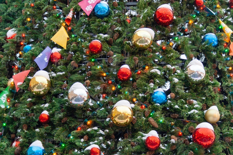 Рождественская елка, украшенная разноцветными шариками (фон, текстура)