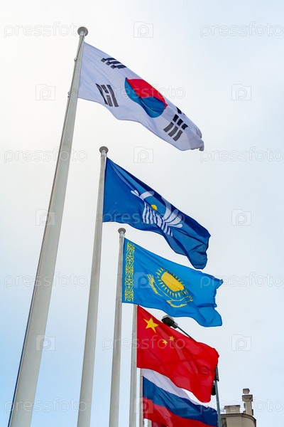 Вид на флаги Китая, Казахстана, Южной Кореи, России и Содружества Независимых Государств на фоне облачного неба