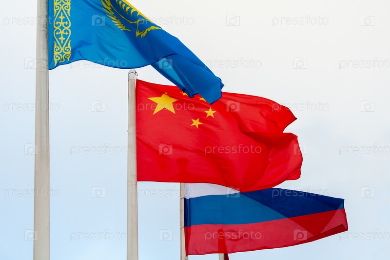 Вид на развевающиеся флаги Китая, России и Казахстана на фоне облачного неба