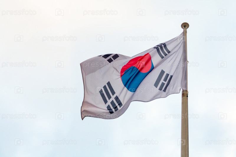 Вид на флаг Южной Кореи на фоне серого облачного неба