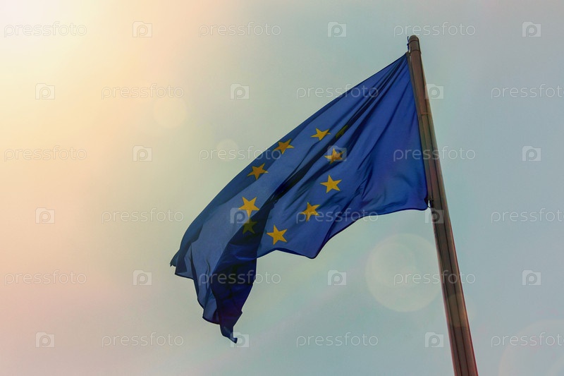 Драматический вид на темный силуэт флага Евросоюза на фоне солнечного света