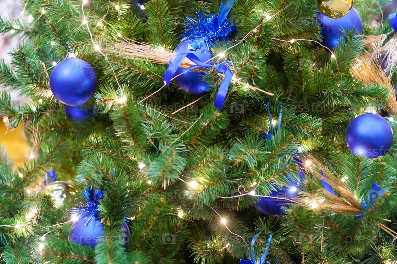 Вид на рождественскую елку, украшенную синими шариками