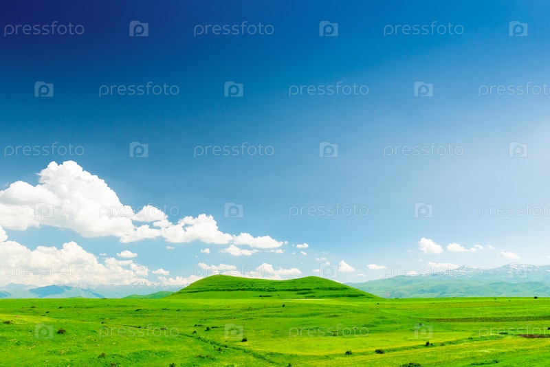 Летний полевой пейзаж и зеленые холмы, покрытые пышной травой
