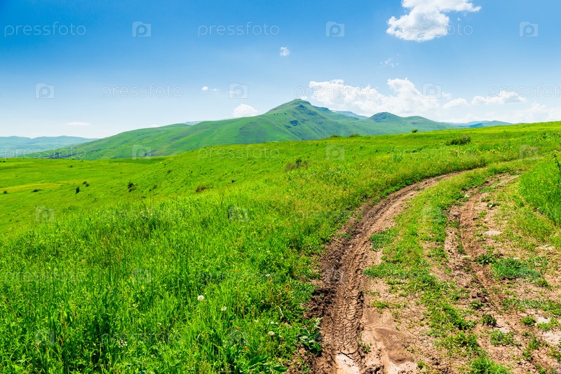 Грязная грунтовая дорога в зеленом поле на фоне холмов в солнечный день