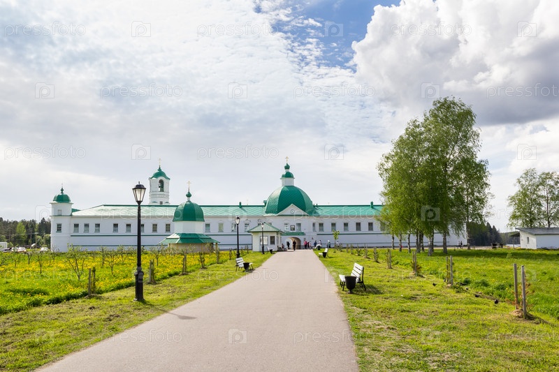 Вид на монастырскую дорогу и Преображенская часть Свято-Троицкого Александра Свирского мужского монастыря