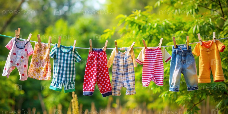 Одежда висит на линии одежды с деревьями на заднем плане. Генерирующий ИИ