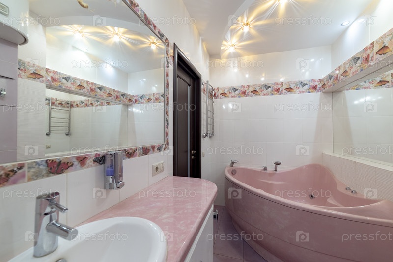 Интерьер санузла с зеркалом и большой ванной