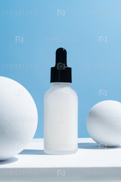 Лицевая сыворотка в стеклянной капельнице на белом подиуме и шарики на синем фоне. Естественный косметический уход за кожей. Концепция рутины красоты. Минимальный состав. Модный продукт для брендинга