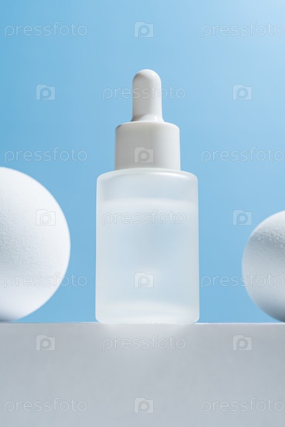 Лицевая сыворотка в стеклянной капельнице на белом подиуме и шарики на синем фоне. Естественный косметический уход за кожей. Концепция рутины красоты. Минимальный состав. Модный продукт для брендинга