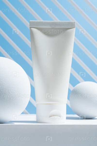 Белая косметическая трубка на синем фоне на подиумах из белого куба. Концепция крема с натуральным ингредиентом и не тестируется на животных