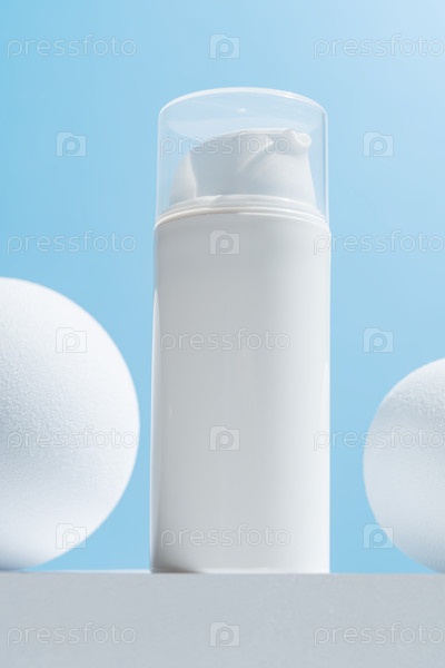 Белый косметический макет бутылки. Пластиковая упаковка для косметологии кремового изделия на белом подиуме на синем фоне. Концепция Skincare