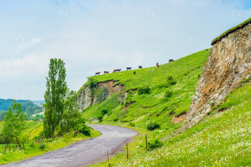 Стадо коров на вершине зеленой горы в Армении возле шоссе