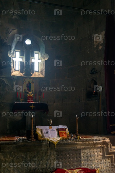 Окна в виде креста, вид на алтарь храма в Татевском монастыре, Армения