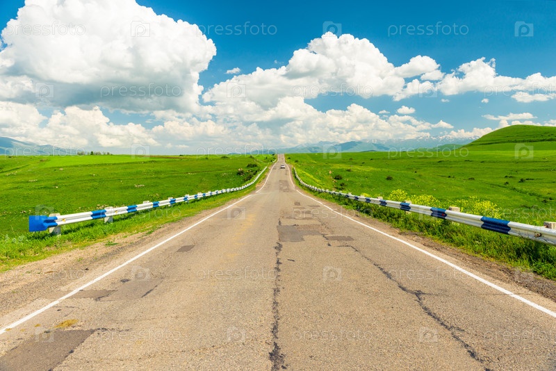 Шоссе для автомобилей в красивом месте в поле, пейзаж в солнечную погоду