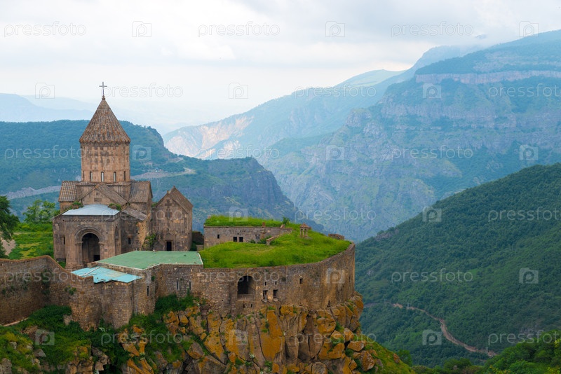Красивый вид на открытку Татевского монастыря и горы Армении