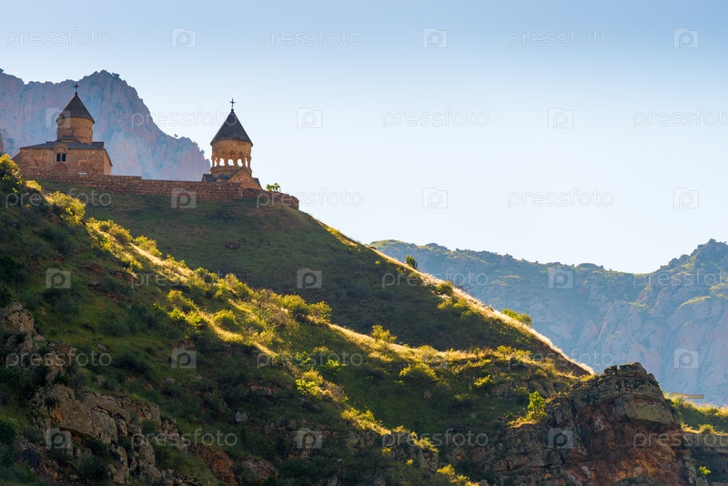 Красивый православный монастырь Нораванк на скале под утренним солнцем, туристическая достопримечательность Армении