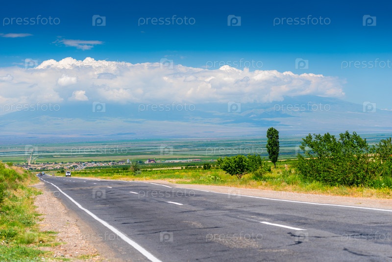 Шоссе, поля и Арарат за облаками, пейзаж Еревана