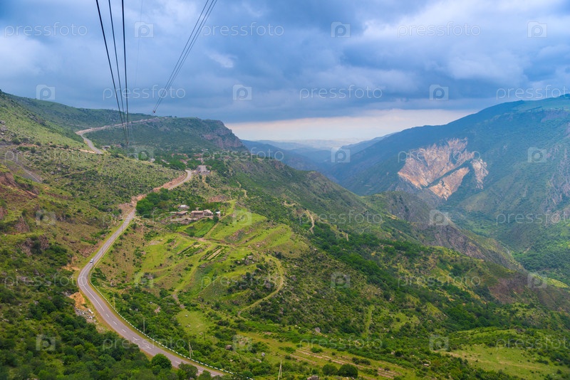 Вид из кабины канатной дороги на горы и дорогу, пейзаж Армении в июне