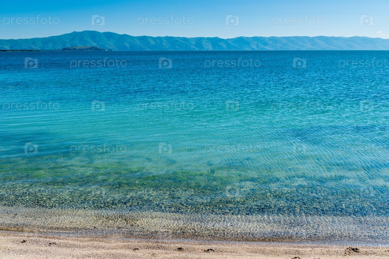 Водная поверхность озера Севан с прекрасным видом на горы, знаменитую природную достопримечательность Армении