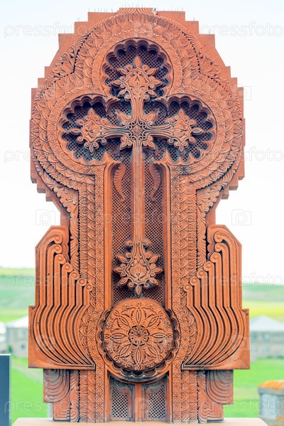 Крест-камень Армянский традиционный хачкар на надгробии кладбища