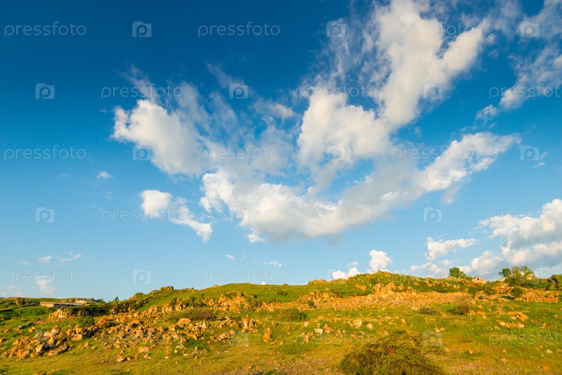 Горы Армении, покрытые зеленью и камнями, облака на голубом небе в солнечный день