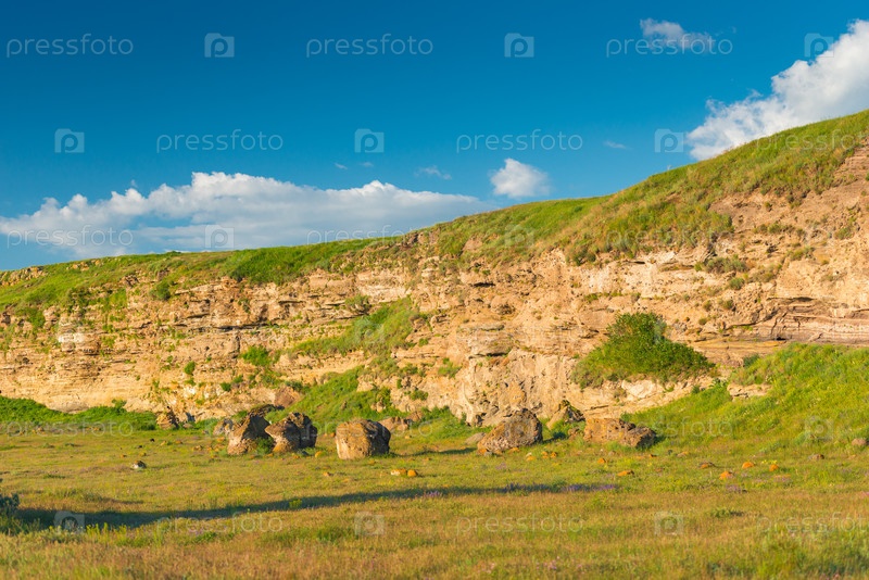 Каменные горы Армении, покрытые зеленью, облака на голубом небе в солнечный день