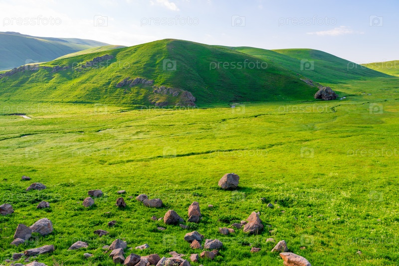 Летний пейзаж, бескрайняя долина Армении, покрытая пышной зеленой травой