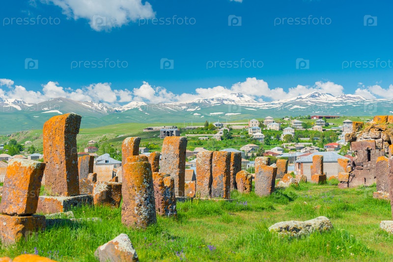Армянские каменные надгробия древних хачкаров на кладбище Норатус