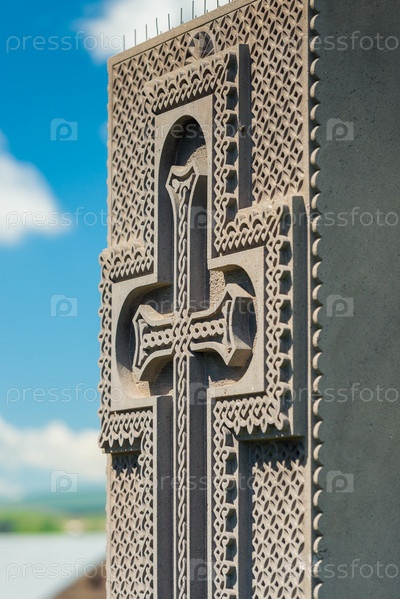 Крупным планом крестовая резьба по камню хачкара армянского традиционного