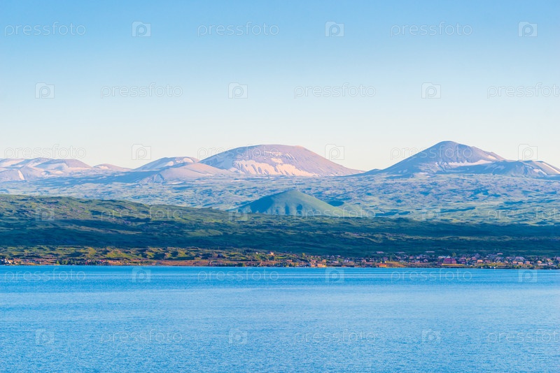 Озеро с чистой водой Севан и красивые живописные горы Армении в летний сезон