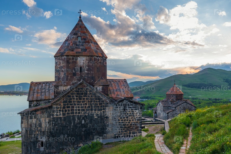 Стрельба в монастыре Севанаванк на озере Севан на закате, Армения
