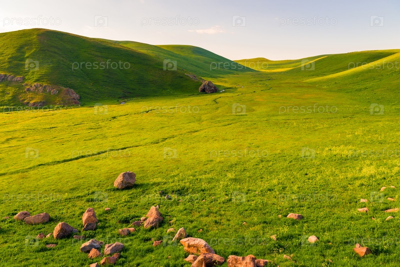 Гладкая зеленая красивая долина гор Армении в июне, красивый пейзаж в солнечный день