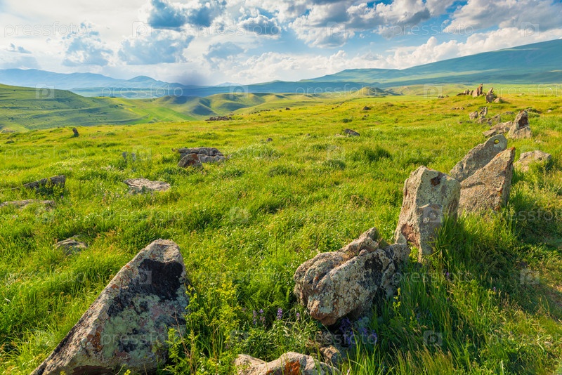 Сочные зеленые поля с камнями в Армении на фоне гор, Зоратс Карер, армянский Стоунхендж
