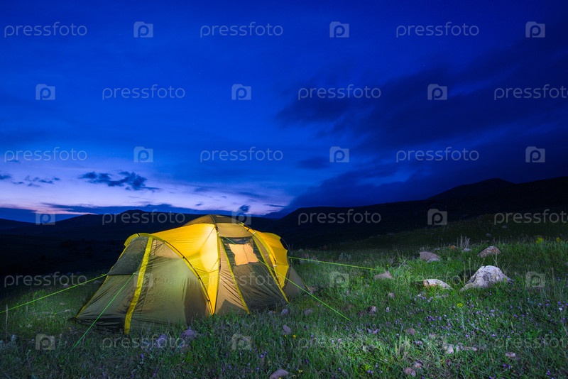Палатка в поле ночью, кемпинг концепт путешествия