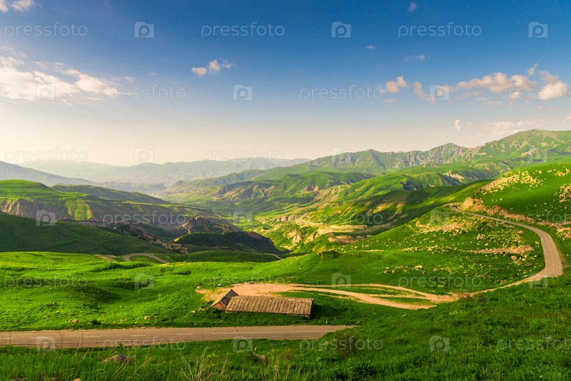 Вид на горную долину Армении и горизонт, зеленые сочные красивые горы