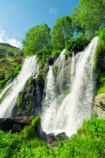 Вертикальная фотография Шакинского водопада Армении, знаменитая природная достопримечательность