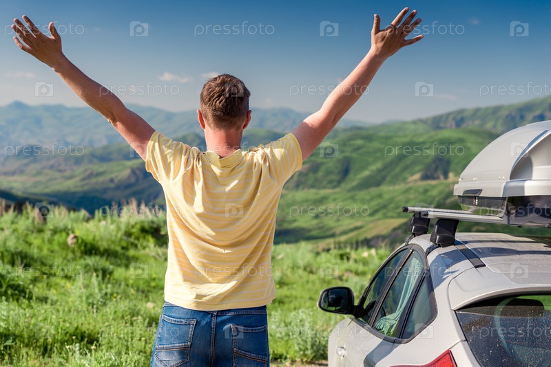 Путешественник стоит рядом с автомобилем и радуется, глядя на красивые горы