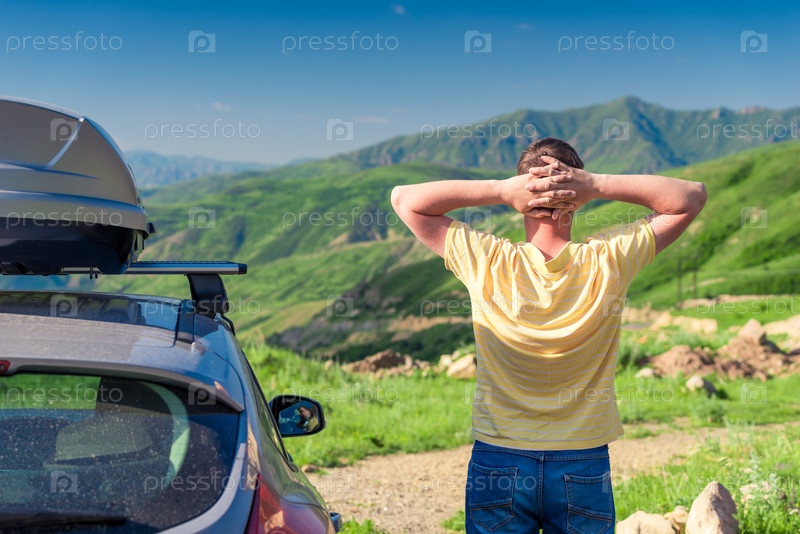 Усталый путешественник отдыхает рядом с автомобилем, любуясь прекрасными пейзажами и горами в летний день