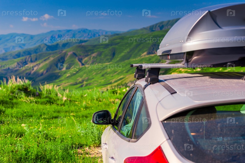 Автомобиль с стойкой на крыше в путешествии на фоне красивых гор Армении