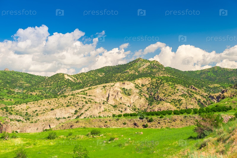 Гора, покрытая кустами и травой против голубого неба в солнечный летний день, пейзаж