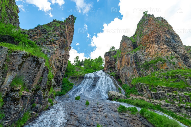 Горизонтальный вид на знаменитую достопримечательность Армении Водопад Русалки в городе Джермук