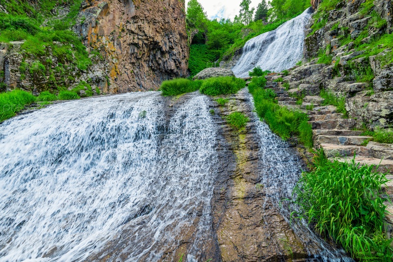 Пейзаж Армении Вид на водопад Mermaid Hair снизу, город Джермук