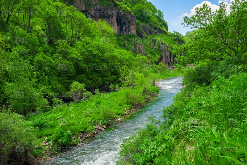Текущая река с горной водой в горах Армении среди зеленых деревьев