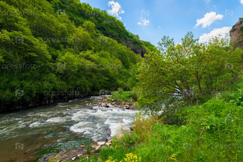 Летний пейзаж реки и деревьев в горном месте в солнечный день