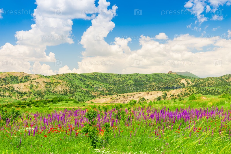 Летнее поле с красивыми фиолетовыми цветами в высокогорье в летний солнечный день