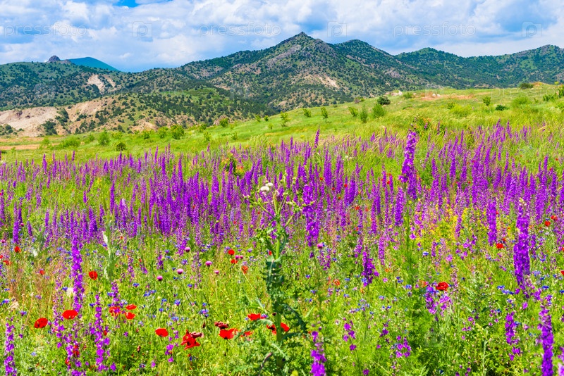 Пейзаж Армении - цветущее поле в горах в солнечный летний день