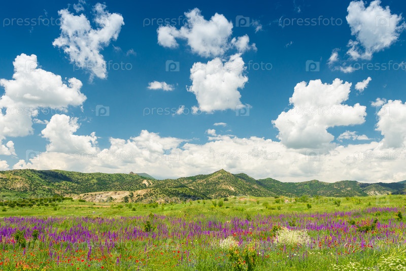 Красивое небо над полем с цветами в горах Армении