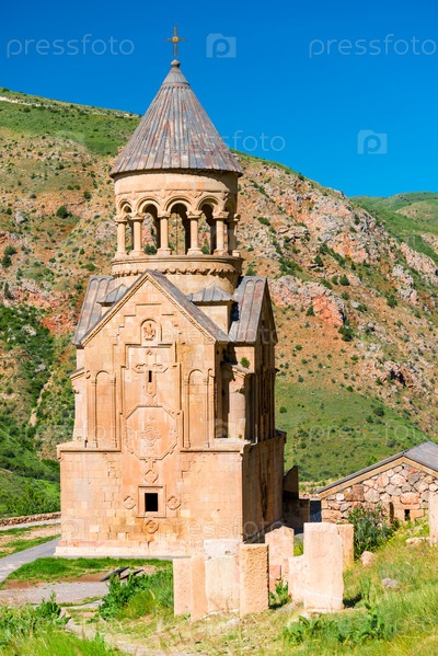 Вид на Нораванкский монастырь на красной скале летним утром, знаменитая достопримечательность Армении