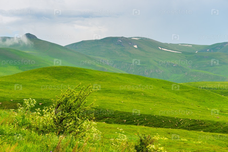 Зеленое поле и холм, покрытый травой на солнечном дневном пейзаже